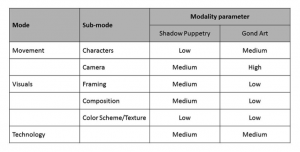 This research draws on the visual grammar of Kress and van Leeuwen including terms like ‘mode’ and ‘modality.’ The references discussed above talks about semiotics in term of films and not specifically the animated films. This encompasses the need for redefining the modes in the context of animation films. As the scope of this research, the mode of movement, visuals and technology are selectively picked assuming them to be the major distinguishing factors within the paradigm of animated films. Referring the structure of Multimodal Matrix framework, the mode of movement is further divided into sub-modes of characters and camera while the mode of visuals into sub-modes of framing, composition and color scheme/texture. The semiotic analysis during this research is captured in a form of Mode-Modality matrix, as an effective framework for adapting any Indian vernacular art into the animation medium. This matrix showcases a comparative analysis of decisions taken for both the targeted art forms. The modality in the context of this research is the status of retaining the essence/identity of an art form. Each of the modes along with their sub-modes are mapped against the modality parameter. The modality parameter is defined here as the level of variance taken into account while deviating from the traditional practices of each art form. This modality parameter can have three possible value namely Low, Medium and High. The ‘Low’ value signifies that during this assimilation process the particular mode is kept very close to the actual traditional practice of that art form. Similarly, the ‘High’ value signifies that for a particular mode, assimilation process introduced a completely new practice or largely deviated from the traditional practice in that art form. The ‘Medium’ value covers a middle ground between the other two values. The whole matrix derived through this process is shown below in Figure 1. The process of deriving appropriate value corresponding to different mode and sub-mode for selected art form is discussed in the subsequent sections.