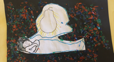 The participants drew images inspired by the story of the Huntsman. The drawings were then coloured, and some were textured using chopped-up cellophane.
