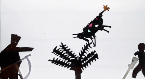Within the clutter and jargon of the animation process, ideas flourished, and were (eventually) laid down for everyone to see. Through the process of animation, a tentative drawing was converted into movement and its idea transformed into something bolder through attention. Each frame sits and waits for the next moments of its life to be decided. The focus on the animation, the concentration on the process, the rhythm of small movements and the capture of a frame, can soon impel the maker into a state of creative reverie. Interruptions of this reverie regularly occur, with mobile phone calls, translation needs, advice on a cut-out piece, a narrative detail or even some loud drumming from outside. The noise of rehearsals from the nearby musicians and the puppeteers working on their own storytelling projects was a challenge for the animators. Progress could be very slow.