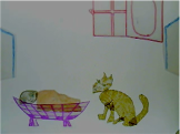 The expressive nature of the cat and baby drawing, made just after we had heard the story carried through into the animation. When our piece was screened, the members of the audience joined in to make the sound of the snake, “shhhhhhhhhhhhhhheeeellllllll.”