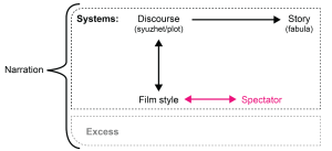 Bordwell (1985, p. 50, 53) highlights the close linkage between style and discourse (syuzhet). Both are strongly involved in the phenomenological process, that is, how the spectator receives the story, but where discourse takes care of the dramaturgical elements, style handles the technical side. Both elements are of course strongly intertwined; for example, discourse space is largely determined by the framing (cinematography) and the mise en scène.