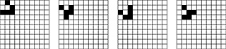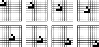 Fig. 9 – Four generations of 'a glider'Frame rate (ƒ) x Spacing (λ) = s (speed of movement of an animated object) For a given frame rate, an animator would increase the spacing to increase the speed of movement of an animated object. If the frame rate were increased, then for a given speed of movement the animator could decrease the spacing. Of course increases in spacing and decreases in frame rate are limited by the need to retain smooth and continuous animation. If the spacing is too large or the frame rate too low then the animation becomes jumpy. We can now develop our earlier expression of this relationship. For any given speed of movement of an animated object when the frequency is higher and the spacing is smaller than our spatial and temporal acuity can resolve we see the gaps and the intermittent showing of the static frames as continuous and the movement as smooth. This, and not persistence of vision, explains why a sequence of still images appears to be a continuous moving image. Each of these, ‘continuity' and ‘motion', can be independent of each other. We can see continuity without, necessarily, seeing motion and we can see motion without, necessarily, seeing continuity. When they come together we can see continuous motion and we have the conditions for animation and cinema. Although continuity and motion can be independent of each other, our perceptual response and our tendency to make economic assumptions rely on each other. A faster frame rate gives the viewer, with a given temporal acuity, less time for consideration and so it is more likely that the economic assumptions will be made. If two images are presented side by side on a page (as in figures 7, 8, 9 and 10), a viewer has time to choose whether to see them as two images in a motion sequence or as something else. This choice is scarcely available when it is presented 24 times a second. Similarly, the economic assumptions make the temporal acuity more effective. That is, the threshold frame rate, at which the sequence of static images is seen as continuous motion, can be lower. The overlooking of gaps and our willingness to overlook substitutions can be exploited because we can use the gaps (when the lights are off) to change the picture (in one frame) for a slightly different picture (in the next frame). We see the intermittent signal as a continuous image because of the interaction between the frequency of the projected images (frame rate) and our perceptual acuity. When this is combined with our tendency to integrate a sequence of incrementally different pictures into one change or movement we have a continuous and changing image, a continuously moving image. In this paper I have sought to correct a faulty explanation of some basic aspects of the film and animation experience and to demonstrate the value of using chronophotography as a research tool for investigating space, time and movement. A large number of diverse aesthetic codes and strategies are used within visual art to represent and construct our experiences of space, time and movement. The ideas that inform the making and viewing of these works can be clustered under a number of key ideas. These ideas include simultaneity, duration, subjective time, objective time, the instant and pace. A small number of examples will illustrate the interrelationship between the works, the ideas that inform them and the use of particular technologies. In works such as Two Consciousness Projection(s) (Graham 1972) Dan Graham uses video to explore subjective time and the difference between time, as it is experienced, and immanent objective time. In this work, a performer is recorded whilst she is watching a monitor that shows her performance. A second performer, who is behind the camera, attempts to give an objective, distanced account of this performance. In a work such as Two Monitors and two Mirrors at opposite sides of a room (Graham 1975) Graham uses two cameras, two mirrors and time delays between the two monitors to show different modes of perception simultaneously and to bring out the discontinuity between different realities. Nam June Paik also manipulates time to show different concepts of time and uses technology that was new at the time to exploit the phenomenon of the simultaneity of different events taking place at different times in different places. In his Good Morning Mr Orwell (Paik 1984) Nam June Paik used a satellite link to present a number of artists who were performing in Paris and New York as if they were appearing live and together on 1 January 1984. Artists have used different strategies to force the viewer to experience time passing slowly. In Michael Snow's film Wavelength (Snow 1967) the camera takes a single uninterrupted 45-minute shot that slowly zooms in on a loft wall. Similarly, In Andy Warhol's film Empire (Warhol 1964) eight cameras record, in real time, nothing more than the light changing on the side of the Empire State Building. In both these films, processes that have no intrinsic interest cause the viewer to introject the passage of real time. In contrast, artists such as Goya and Monet have represented the experience of time moving rapidly in different ways. In Goya's Saturn devouring one of his children (Goya 1823) the indexical movement of the brush and the application of paint is used for the first time to express speed or the rapidity of movement. Saturn is the Roman name for the Greek God ‘Cronos' who is both the God of Chaos and of Time. If we consider Monet's works in series, such as his many paintings of Rouen Cathedral (Monet 1894), then we can see that he was attempting to paint a sequence of related instants of time. Particular codes had to be invented by Monet and other Impressionists because the act of painting a canvas clearly takes longer than the event that is being recorded. There are many events and processes that happen too quickly for the eye to see. At the end of the nineteenth century artists and 