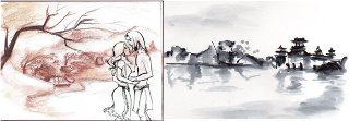 The artistic styles and animation techniques chosen for the projects reflect the inspiration by the research of genuinely Asian art traditions. The use of analogue and digital tools in the process was wholly informed by the artistic intention to re-create these styles in the animation medium. For the story, “The Beach Boy”, a style was developed that combined a muted colour palette with textured crayon backgrounds and a line style reminiscent of the calligraphic quality of traditional Chinese painting.