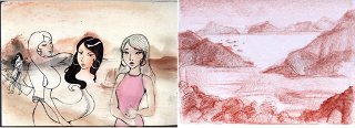 Fig. 2 – Development art from The Beach Boy: artists—Nguyen Hieu Hanh and Tran Ngoc Viet Tu For the experimental animation of his concept, the newly developed 2D animation CACAni software (Qiu et al., 2005a) was used, which enabled inbetweening of key frames with a varied thickness of lines.