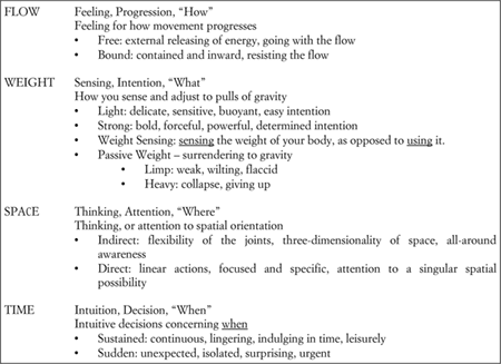The Effort category has become the most widely known aspect of LMA due to its extensive practice within theater. Effort delineates qualities of movement as ongoing fluctuations between Light and Strong Weight, Indirect or Direct Space, Sustained or Sudden Time, and Free or Bound Flow. The four Effort Factors of Weight, Space, Time and Flow are linked with C. G. Jung’s four ego functions: sensing, thinking, intuiting and feeling. From these associations, we observe that a mover’s Flow of Weight in Space and Time communicates information about physical sensations and the agency to mobilize one’s weight with delicacy or force, the broadness or focus of thought, the intuitive leisureliness or urgency of decisions, and the release or control of feelings (Bloom, 2006). The eight Effort qualities emerge in combinations of two elements, forming “states,” three elements, creating “drives,” and in the rare case of an extreme and compelling movement, four elements combine in a “full Effort action.”