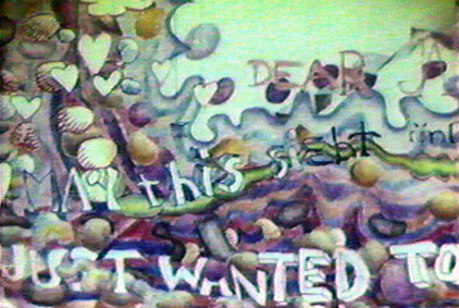 In Dear Janice (1972) Beckett used 24 separate drawings and, as the title suggests, it is a letter of sorts to a friend. The text of the letter provides the structural foundation, and the space is gradually filled with objects such as hearts morphing into breasts, blobs of color changing shape and unfolding geometric shapes. He is animating a continuous cycle and also changing the camera position so that the frame, at times, follows selected shapes around a circular path, or moves 'back' (up on the animation stand) to reveal the complex animated universe in motion. The circular path of the animation leaves the center space empty and after the animated sequence is completed, Beckett optically prints live action into this area. Here we see several elements that are consistent in Beckett's films – specifically humor, the influence of pop culture imagery, and the absence of 'subject' as the imagery is present for its graphic content, not to convey larger meaning. The exception to the above is his film Heavy-Light which is serious and mysterious, with no overt humor or connection to pop imagery.