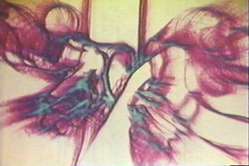 Heavy-Light (1973) stands apart from Beckett's others in that it is completely abstract, having no reference to an actual form and no recognizable image. It appears to be made of pure, colored light, traveling through the screen space in a variety of movements. At times the light forms appear to dart around on a triangular path, and sometimes they swirl and float, and engulf the viewer. Suggesting light in motion, the images have an electric quality and resemble imagery created via video feedback or perhaps computer graphics. However, like all of his films, Heavy-Light's source is drawn. The incredible variety of shapes and movements seen here come from a cycle of thirteen drawings.6 This is perhaps the apex of Beckett's mastery of the optical printer.