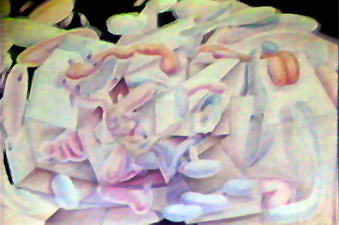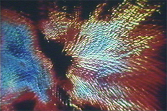 Flesh Flows (1974) is based on recognizable, imaginative forms that are somewhat erotic, and that change into other shapes, or create a landscape of sorts. This film is unique in that it is not based on a cycle. Instead the entire animation sequence is repeated three times, with the second and third repetitions transformed into a more ethereal, abstracted space via his work on the optical printer. The resulting abstracted imagery takes on a life of its own, becoming seething, nebulous trails of color that briefly redefine as the original shape emerges, then disintegrate into the changing mass.