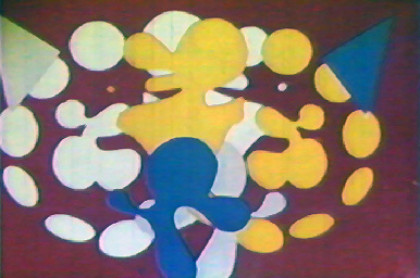 Once recorded on film, the animation would then be taken to the optical printer, were he re-photographed the frames, phasing the image in time, changing the colors and scale of the image. Multiple passes were made, layering the image onto itself, slightly altered, creating a new version of itself. It is easy to see here a connection to video image processing and the idea of feedback.